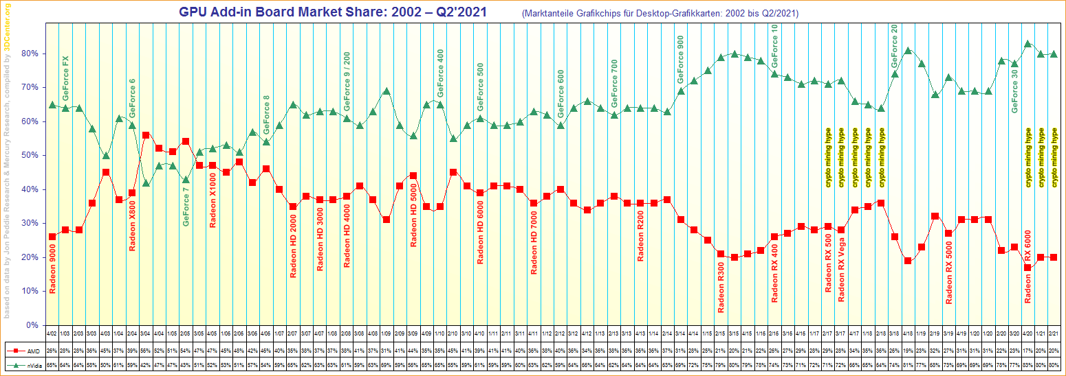 Rein vom Zahlenmaterial her befindet sich der Grafikkarten-Markt in einem vergleichsweise "normalen" Stadium, der kleine Rückgang zum letzten Quartal ist Saison-bedingt üblich und die insgesamte Auslieferungsmenge entspricht einem gutklassigem vor-Krisen-Stand. Verglichen mit "damals" verkauft AMD derzeit allerdings erheblich weniger als üblicherweise (vor-Krise-Niveau ca. 3-3½ Mio. Stück pro Quartal), was derzeit durch nVidia aufgefangen wird, damit aber eben auch eine insgesamt beachtbar höhere Auslieferungsmenge verhindert. Gleichzeitig befindet sich AMD somit mal wieder am unteren Ende der Marktanteils-Historie – noch nicht auf absoluten Tiefstständen (nur 17% Marktanteil im vierten Quartal 2020), aber dennoch vergleichsweise nahe dran. Zu normalen Zeiten würde dies Bedenken auslösen, ob AMD diesen Wettstreit noch lange mithalten kann bzw. ob solcherart niedrige Marktanteile langfristig nicht negative Effekte auslösen könnten.
